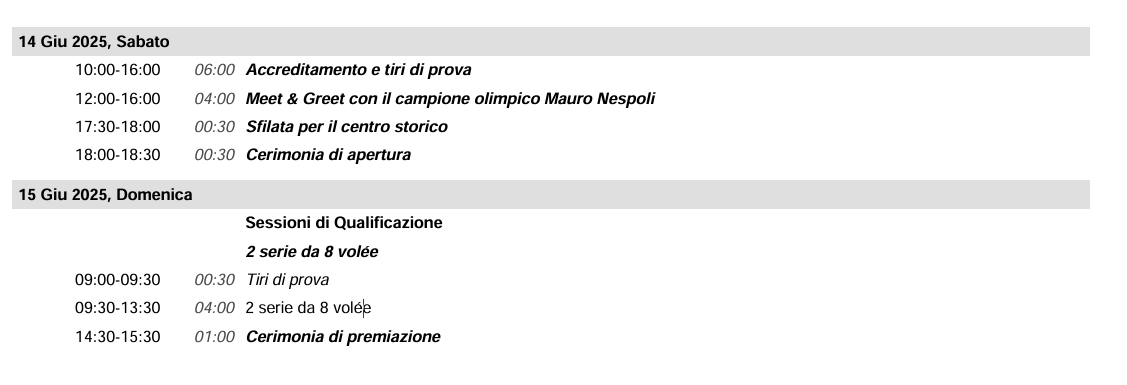 Domenica 15 giugno: competizioni ufficiali, premiazioni e attività aperte anche ai visitatori, che potranno cimentarsi con il tiro con l’arco e visitare gli stand allestiti.